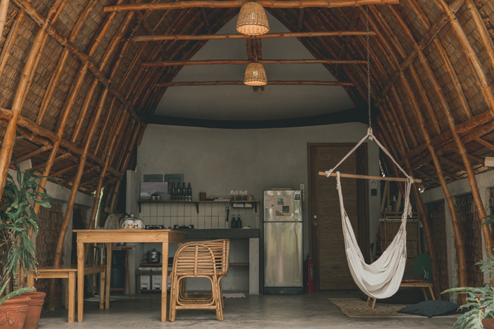 A bamboo villa nestled between the ocean and the mountains, this sustainable retreat is powered by solar energy and features a Terra Wall, a sustainable wall cooling system that ensures the space is above temperature from the outdoors at all times.